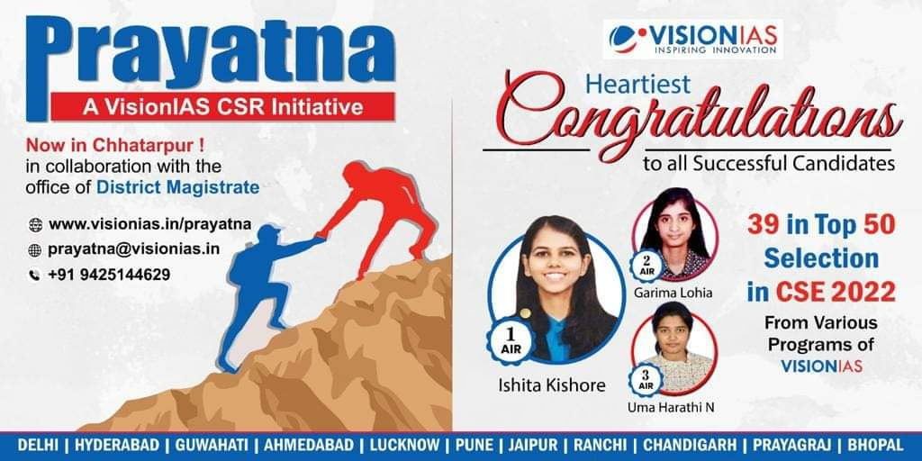 छतरपुर जिले के प्रतियोगी परीक्षाओं और आईएएस की तैयारी करने वाले विद्यार्थियों के लिए सुनहरा अवसर आया है। कलेक्टर श्री संदीप जी.आर. के संवेदनशील प्रयास और विजन आईएएस की निदेशक सुश्री दीपाली चतुर्वेदी की पहल के फलस्वरूप प्रयत्न पहल होने जा रही है। यूपीएससी की तैयारी करने वाले विद्यार्थी वेबसाइट www.visionias.in/prayatna पर जाकर अपना रजिस्ट्रेशन कर सकते हैं।