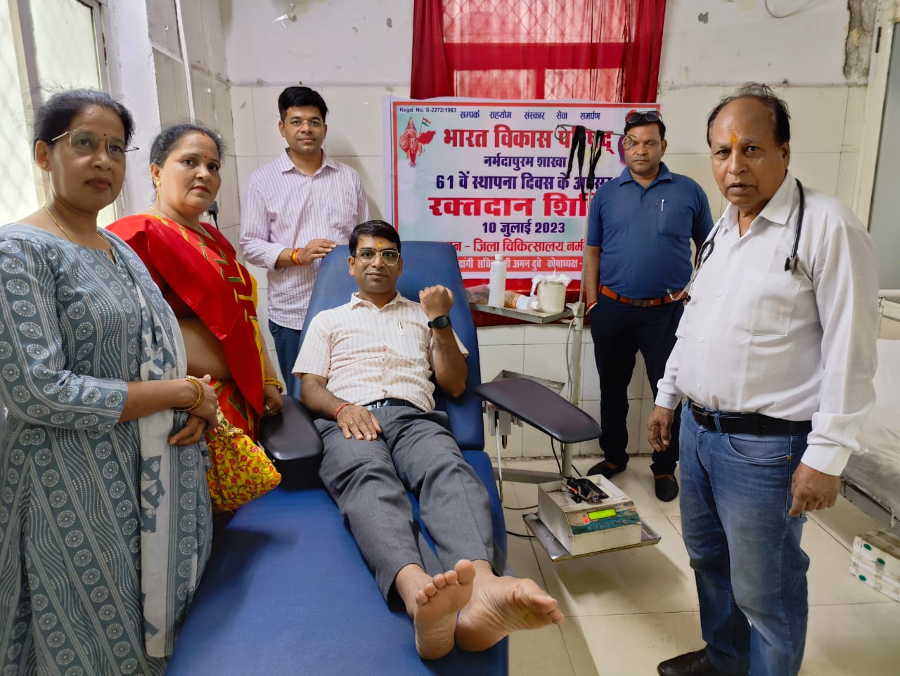 नर्मदापुरम। भारत विकास परिषद् के 61 वे स्थापना दिवस के अवसर पर आज 10 जुलाई सोमवार को भारत विकास परिषद् , नर्मदापुरम शाखा द्वारा जिला चिकित्सालय नर्मदापुरम में रक्तदान शिविर का आयोजन किया गया । जिसमे भारत विकास परिषद के अध्यक्ष डीएस दांगी , संरक्षक डा अतुल सेठा, सचिव अमन दुबे, कोषाध्यक्ष पवन मित्तल ( CA) , श्रीमती वंदना शर्मा , श्रीमती गायत्री अग्रवाल, श्रीमती उषा अग्रवाल एवं अन्य सदस्य उपस्थित रहे । डॉ अतुल सेठा एवं उनके सुपुत्र अभिनव सेठा, डॉ उमेश सेठा , CA पवन मित्तल, राकेश चौहान, प्रीतम सिंह सहित अन्य सदस्यों ने रक्त दान किया। इस अवसर पर सचिव अमन दुबे,कोषाध्यक्ष पवन मित्तल ( CA) , श्रीमती वन्दना शर्मा , श्रीमती ऊषा अग्रवाल , श्रीमती गायत्री अग्रवाल , पप्पू भदोरिया, राजेश गौर व अन्य सदस्यों ने सहयोग किया । शिविर में ब्लड बैंक एवम जिला रेडक्रास सोसाइटी नर्मदापुरम की टीम में डॉ रविकांत शर्मा, डॉ आर गंगराड़े, डॉ दिनेश यादव, उदित द्विवेदी, शेरसिंह बड़कुर, श्रीजी के शर्मा , धीरज मंडलोई, यशवती साहू , मुकेश बड़कुर सहित अन्य पदाधिकारी सदस्य गण का भी सहयोग रहा ।