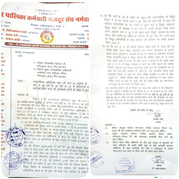 नगरपालिका में पदस्थ कर्मचारियों का भी मान सम्मान होता है वह मध्य प्रदेश शासन की सेवा कर रहे है मजदूर संघ नगरपालिका के सभी पार्षद व पार्षद पतियों से अपेक्षा करता है कि कर्मचारियों से न उलझ कर आपके वार्ड में जो भी कार्य है नगरपालिका अध्यक्ष महोदया व सीएमओ साहब व विभागीय अधिकारियों के माध्यम से काम के निपटान का प्रयास करे पार्षद राहुल गौर, पार्षद श्रीमती रिचा तिवारी, श्रीमती विंदिया मांझी को नगरपालिका अधिनियम 1961 की धारा 41 (1) (क) के तहत आयोग्य घोषित किया जावे इस अधिनियम के तहत कलेक्टर महोदय को पूरे अधिकार दिए गये हैं नगरपालिका प्रशासन, जिला प्रशासन, मध्य प्रदेश शासन से पत्र व्यवहार करके शिकायत प्रार्थना पत्र दिया है अभद्रतापूर्ण व्यवहार व गाली गलौच को लेकर पुलिस प्रशासन में भी नामजद एफआईआर मजदूर संघ दर्ज करायेगा अगर बाध्य किया गया तो जिले में भारतीय मजदूर संघ के विभिन्न विभागों के अठारह कर्मचारी संगठन नगरपालिका कर्मचारियों के हित में आंदोलनात्मक कार्यवाही करेगें जिसका संपूर्ण दायित्व पार्षदगण व पार्षद पतियों व राजनैतिक दलो के आकाओं का होगा।