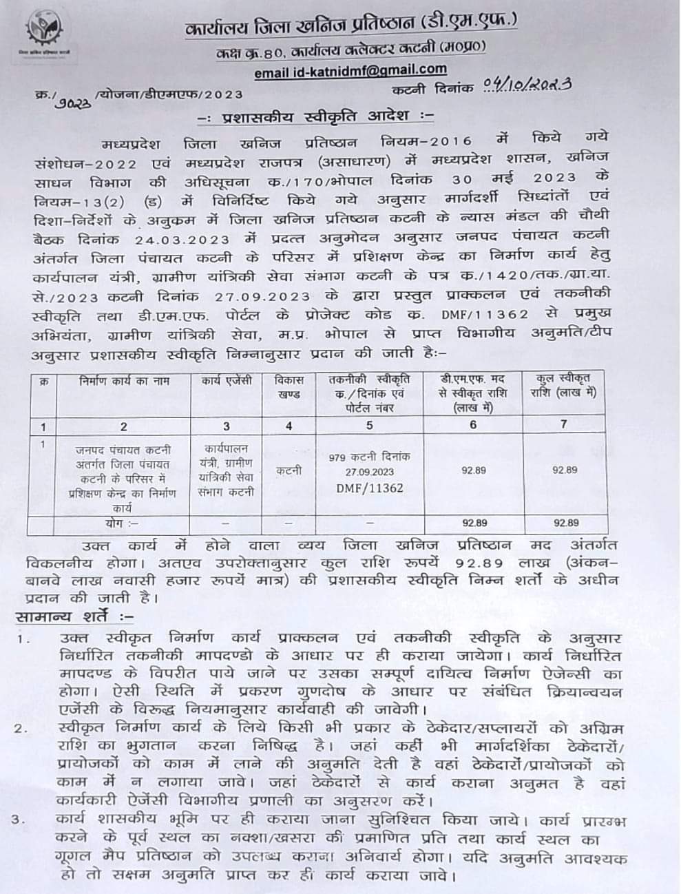 कलेक्टर अविप्रसाद ने जिला खनिज प्रतिष्ठान मद से विधायक मुडवारा संदीप जासवाल की अनुशंसा पर जनपद पंचायत कटनी के अंतर्गत जिला पंचायत परिसर में प्रशिक्षण केंद्र का निर्माण करने 92.89 लाख रुपए की प्रशासकीय स्वीकृति प्रदान की है।