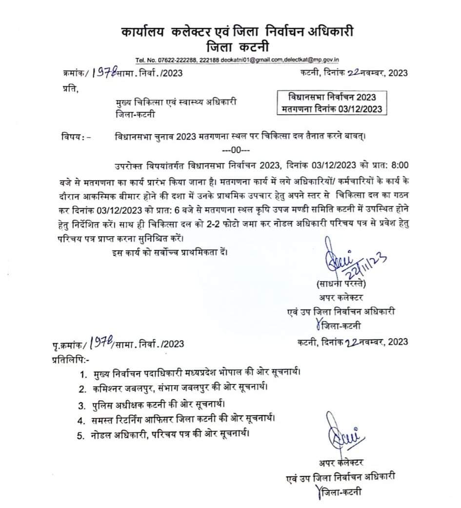 अपर कलेक्टर एवं उप जिला निर्वाचन अधिकारी साधना परस्ते ने मुख्य चिकित्सा एवं स्वास्थ्य अधिकारी को मतगणना कार्य में संलग्न अधिकारियों एवं कर्मचारियों के कार्य के दौरान आकस्मिक बीमार होने की दशा में उनके प्राथमिक उपचार हेतु चिकित्सा दल का गठन कर प्रातः 6 बजे से मतगणना स्थल कृषि उपज मण्डी समिति कटनी में उपस्थित होने के निर्देश दिए है।