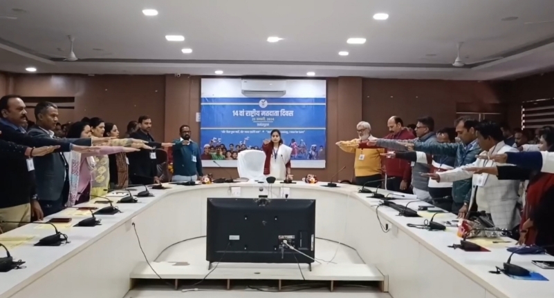 14वें राष्ट्रीय मतदाता दिवस के अवसर पर कलेक्टर सुश्री सोनिया मीना ने कलेक्ट्रेट कार्यालय के सभाकक्ष में सभी शासकीय अधिकारियों कर्मचारियों को लोकतांत्रिक परम्‍पराओं की मर्यादा को बनाए रखने, स्‍वतंत्र, निष्‍पक्ष रूप से मताधिकार का उपयोग करने की शपथ