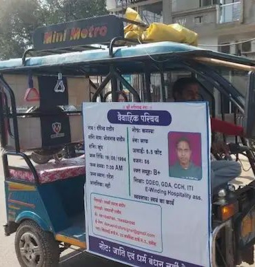 मध्य प्रदेश के दमोह में एक 29 वर्षीय व्यक्ति ने अपने लिए दुल्हन की तलाश में एक अनोखा तरीका अपनाया है और अपने ई-रिक्शा पर अपने इरादे और व्यक्तिगत विवरण की घोषणा करते हुए एक होर्डिंग लगाया है।