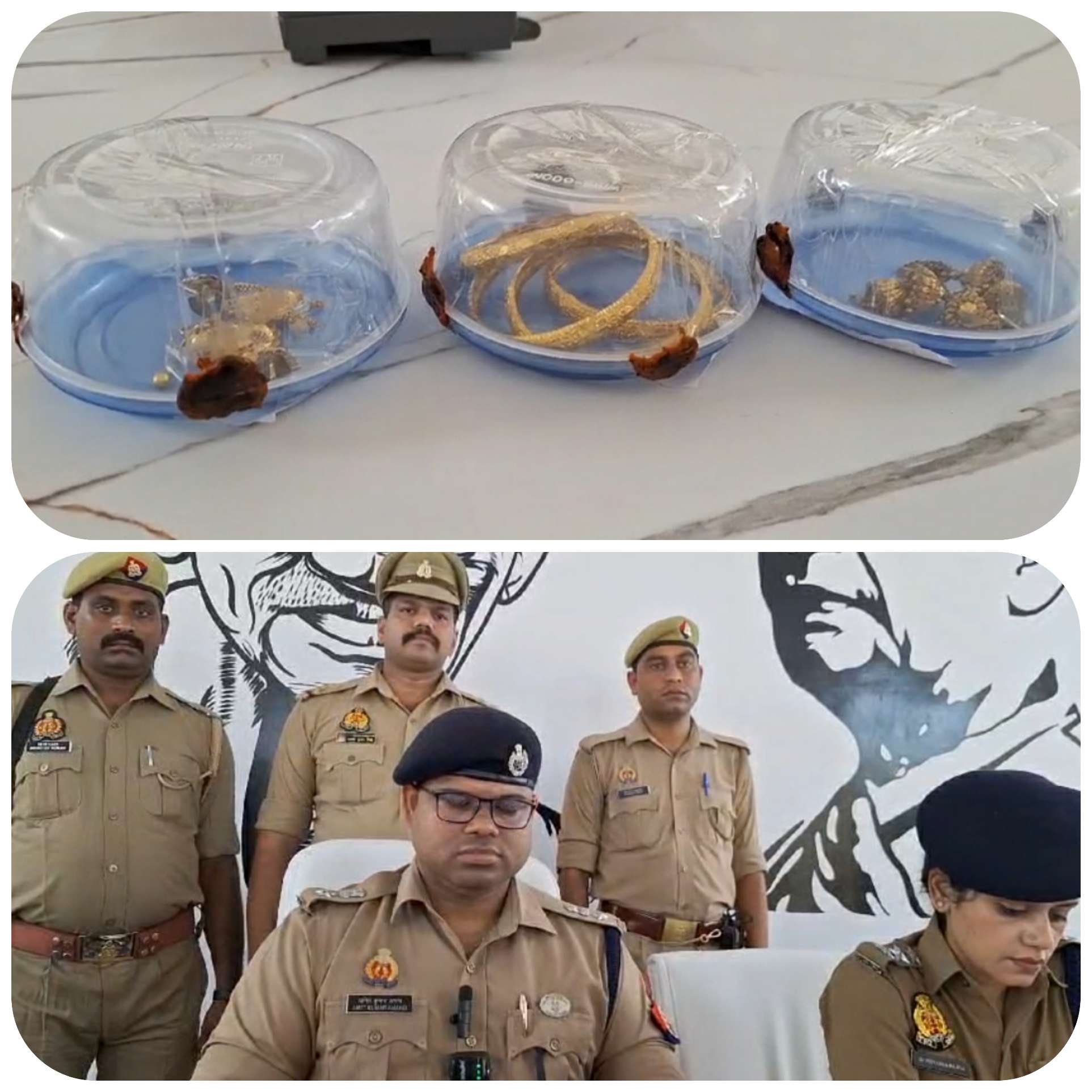 का खुलासा करते हुए इंदरगढ़ पुलिस ने दो बदमाशों को गिरफ्तार कर उनके पास से 4 जोड़ी कंगन एक जोड़ी झाले एक जोड़ी जोड़ी झुमके कान की बाली और एक जोड़ी सुई धागा बरामद किया कन्नौज कन्नौज पुलिस अधीक्षक अमित कुमार आनंद ने चोरी की घटना का अनावरण करते हुए चोरों को गिरफ्तार करने वाली टीम इंदरगढ़ पुलिस को लगभग ₹10000 का इनाम देते हुए आभार व्यक्त किया पुलिस अधीक्षक अमित कुमार आनंद में खुलासा करते हुए दोनों बदमाशों को जेल भेज दिया वहीं इंदरगढ़ क्षेत्र के पटेल नगर तिराहा पर लगभग कुछ दिन पहले 8 से 9 लाख की चोरी का अभी तक पुलिस नहीं लगा सकी सुराग कई लोगों को उठाकर की गई पूछताछ लेकिन ठोस सबूत न होने के चलते अभी तक अंधेरे में तीर चला रही पुलिस वहीं पीड़ित हुआ परेशान