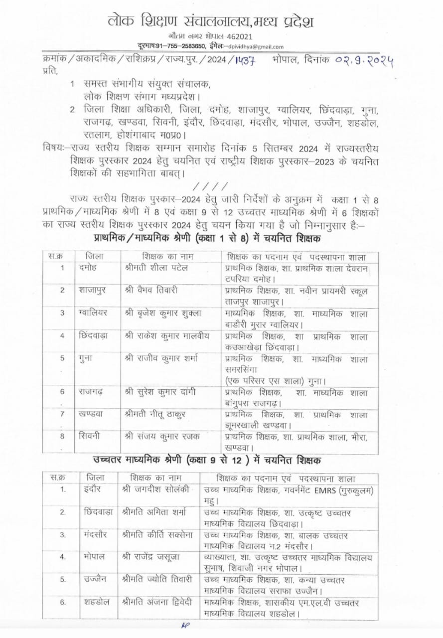 14 शिक्षकों को राज्य स्तरीय शिक्षक सम्मान  5 सितंबर शिक्षक दिवस पर मुख्यमंत्री डॉक्टर मोहन यादव जी करेंगे सम्मान