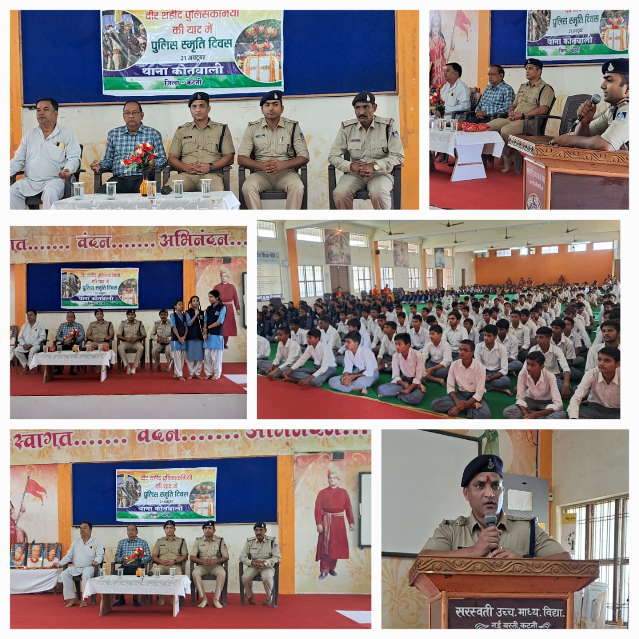 पुलिस अधीक्षक अभिजीत कुमार रंजन (भा.पु.से.)* द्वारा *पुलिस स्मृति दिवस 21 अक्टूबर* के उपलक्ष्य में पुलिस मुख्यालय के निर्देशानुसार दिनांक 21.10.2024 से 30.10.2024 तक पुलिस शहीदों के योगदान की स्मृति में विभिन्न कार्यक्रम आयोजित किए जाने हेतु निर्देशित किया गया है। जिसके पालन में थाना प्रभारी कोतवाली द्वारा आज दिनांक 26.10.2024 को सरस्वती उच्चतर माध्यमिक विद्यालय कटनी में वीर शहीद पुलिसकर्मियों की याद में कार्यक्रम आयोजित किया गया। उक्त कार्यक्रम में थाना प्रभारी कोतवाली व उनके स्टाफ सहित, सरस्वती उच्चतर माध्यमिक विद्यालय के प्राचार्य, शिक्षकगण और करीब 500 छात्र-छात्राएं उपस्थित रहे। कार्यक्रम में वीर शहीद पुलिस कर्मियों को याद कर उन्हें श्रद्धा सुमन अर्पित किए गए।
