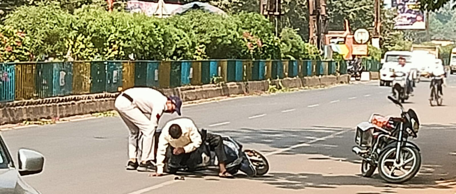 Katni जानकारी के अनुसार हम आपको बता दे कि कटनी बरगवां के पास एक प्रोढ़ मिशन चौक के पास से कलेक्ट्रेट कार्यालय की तरफ जा रहा था तभी *एल.आई.सी* के पास अचनाक स्कूटी अनियंत्रित हुई स्कूटी सवार प्रोढ़ स्कूटी समेत बीच रास्ते में गिर गया जिसमे प्रोढ़ के पैर में गंभीर चोट आई और वही पर मौजूद पॉइंट पर तैनात ट्रैफ़िक कर्मी डुमन दास और पुलिस कर्मी की सहायता से घायल प्रोढ़ को उपचार के लिए भेजा गया।