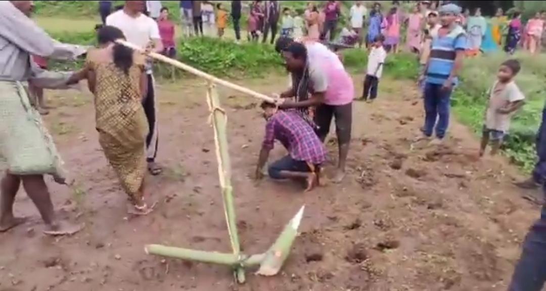 प्रेम प्रसंग के कारण समाज के लोगों ने दोनों को हल में बांध कर खेत जोतवाया है और कोड़े मारे जा रहें है ।
