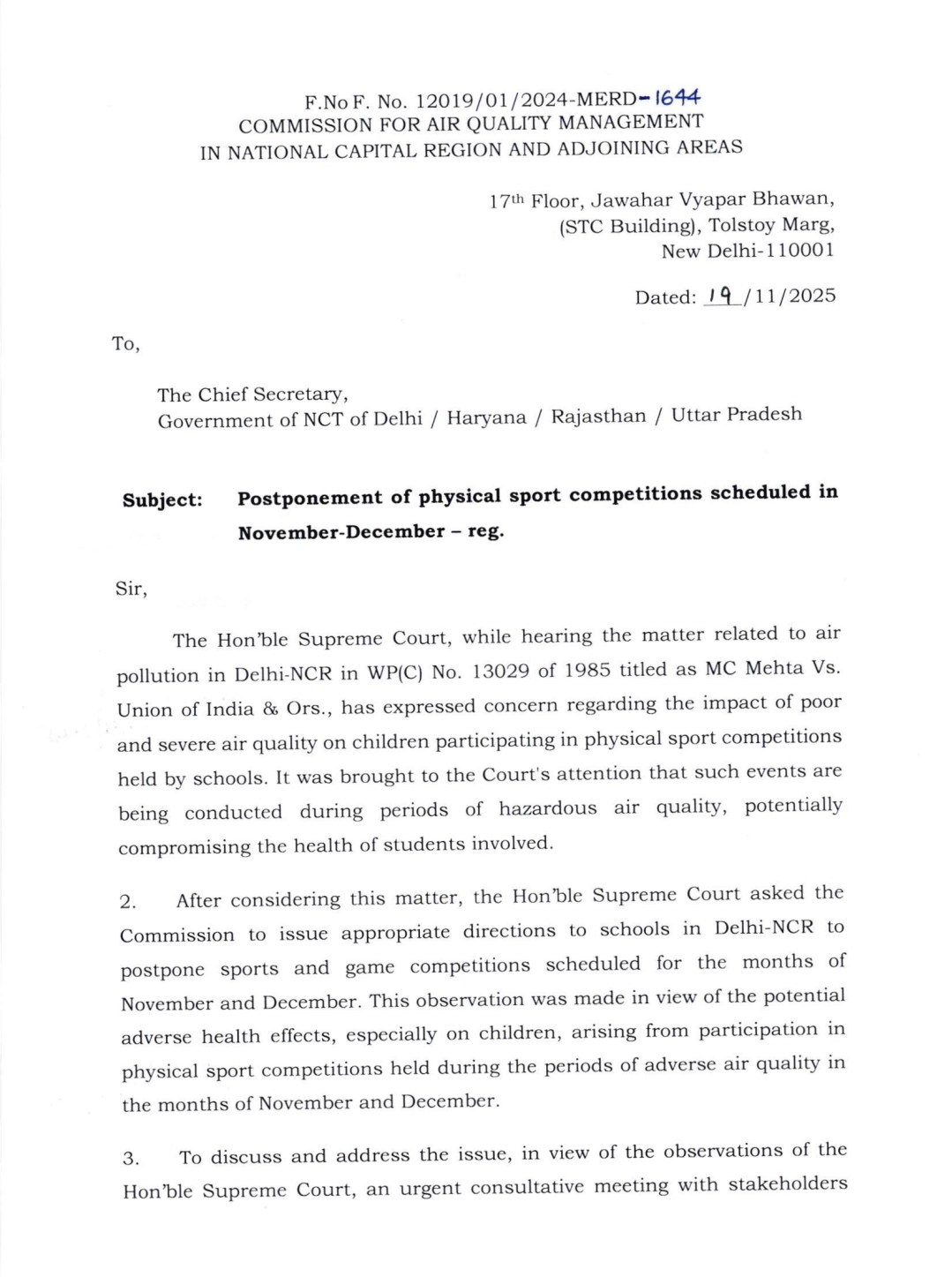इस मुद्दे पर 19 नवंबर 2025 को एक अहम बैठक आयोजित की गई, जिसमें शिक्षा मंत्रालय, NCR राज्यों के प्रतिनिधि, स्पोर्ट्स अथॉरिटी ऑफ इंडिया, NCR प्रदूषण नियंत्रण बोर्ड और DPCC के अधिकारी शामिल हुए। बैठक के बाद आयोग ने यह आदेश जारी किया।