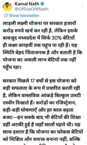 कमलनाथ ने लिखा कि सरकार बीते 17 वर्षों से इस योजना को बड़ी सफलता के रूप में प्रचारित करती रही है, लेकिन ज़मीनी हकीकत इन दावों से बिल्कुल उलट है। करोड़ों रजिस्ट्रेशन, हर साल बढ़ता बजट और बड़ी-बड़ी घोषणाओं के बावजूद बेटियों की शिक्षा में अपेक्षित सुधार नहीं हो सका।