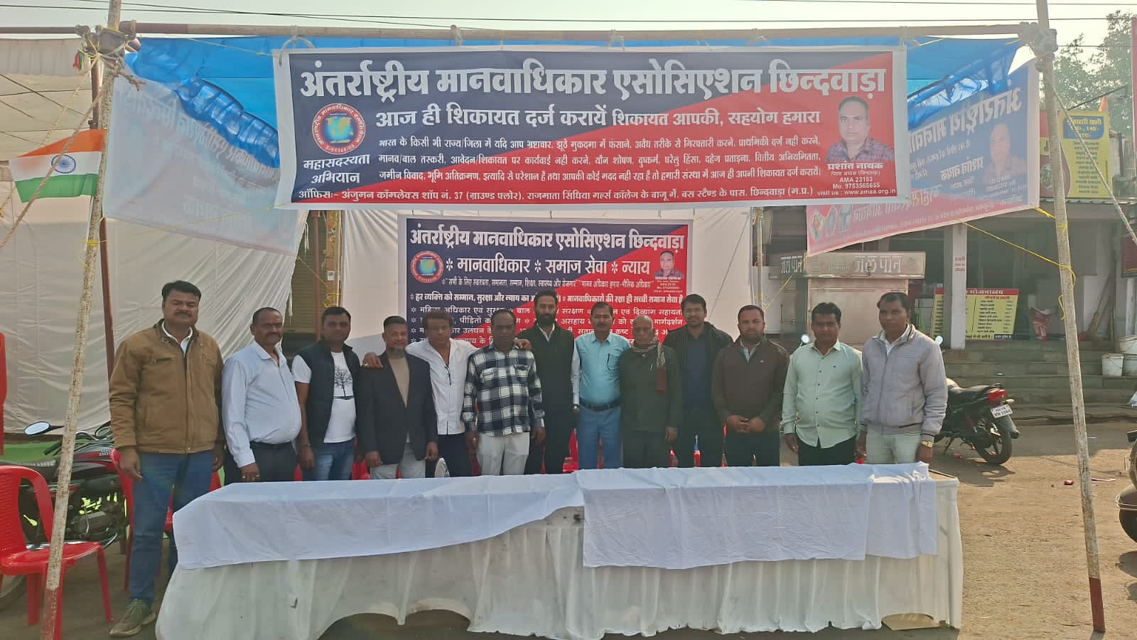 लोकतंत्र के महापर्व 77वें गणतंत्र दिवस के अवसर पर अंतरराष्ट्रीय मानवाधिकार एसोसिएशन छिंदवाड़ा ने पुलिस लाइन के मुख्य द्वार के सामने मानसरोवर बस स्टैंड, छिंदवाड़ा (मध्य प्रदेश) में एक विशेष जागरूकता कैंप लगाया। यहां महिलाओं, पुरुषों, बालक-बालिकाओं को उनके मौलिक अधिकारों के प्रति जागरूक किया गया और समाज में मानवाधिकारों की महत्ता बताई गई।कार्यक्रम में प्रमुख पदाधिकारियों ने शिरकत की, जिनमें जिला अध्यक्ष प्रशांत नायक, जिला सचिव मोहम्मद अबरार सिद्दीकी, जिला कोषाध्यक्ष नारायण डेहरिया, जिला उपाध्यक्ष मनीष मालवीय, जिला कार्यवाहक अध्यक्ष प्रदीप सराठे, जिला वरिष्ठ उपाध्यक्ष संजू नागवंशी, जिला कल्याण सचिव तबरेज दीवान, जिला वरिष्ठ कोषाध्यक्ष अनिल कराडे, जिला मीडिया प्रभारी सचिन विषैले, नगर अध्यक्ष रामेंद्र रघुवंशी, जिला सहसचिव श्रीकांत पटेल, जिला प्रवक्ता भवानी सिंह, नगर उपाध्यक्ष अशफाकउल्ला खान, जिला सदस्य जितेंद्र साहू, जिला वरिष्ठ सदस्य दीना देव फोड़े सहित अन्य सदस्य शामिल रहे।इस मौके पर संगठन ने छात्र-छात्राओं और नन्हे-मुन्ने बच्चों को बिस्कुट के पैकेट बांटे, जिससे कार्यक्रम में उत्साह और बढ़ गया। यह प्रयास छिंदवाड़ा जिले में मानवाधिकार जागरूकता को मजबूत करने की दिशा में सराहनीय कदम है।