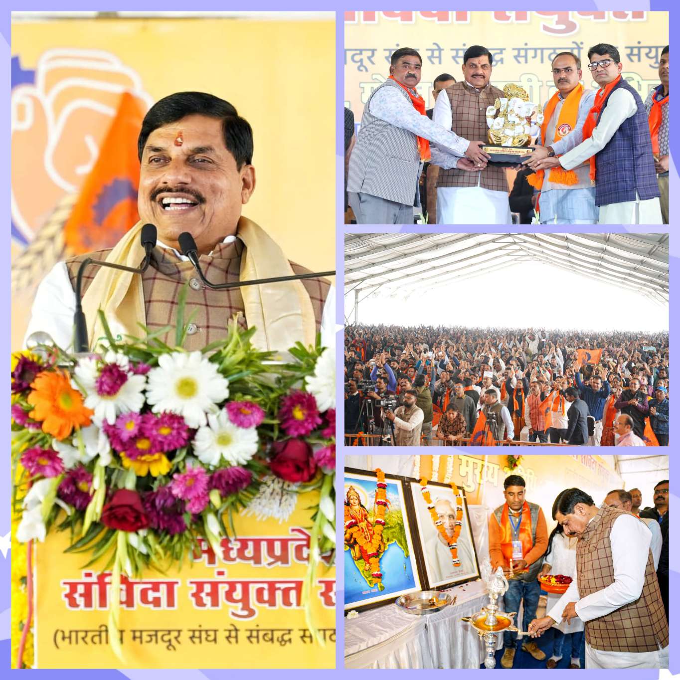 मुख्यमंत्री डॉ. मोहन यादव ने कहा है कि संविदाकर्मियों के श्रम और विश्वास पर ही राज्य सरकार जनकल्याणकारी योजनाओं को धरातल पर उतारने में सफल हो रही है। संविदाकर्मियों की भूमिका हनुमान जी के समान है। आपके श्रम और साझेदारी ने ही शासन-प्रशासन की व्यवस्था बनाई रखी है। संविदाकर्मी अनुबंध से अवश्य आते हैं, किन्तु व्यवस्थाओं के प्रबंधन में विराट भूमिका निभाते हैं। स्वास्थ्य सेवाएं हों या शिक्षा, पंचायत, नगरीय निकाय या तकनीकी सेवाएं मैदानी स्तर पर सर्वे, मॉनीटरिंग और क्रियान्वयन में संविदा भाई-बहन हर जगह व्यवस्था के भरोसेमंद स्तंभ बनकर खड़े हैं। संविदाकर्मियों ने जिस निष्ठा से काम किया है, उसने यह सिद्ध कर दिया कि सेवा पद से बड़ी है। संविदाकर्मी राज्य सरकार का कार्यबल ही नहीं, हमारा आत्मबल भी हैं। भारतीय मजदूर संघ के ‘देश के हित में करेंगे काम’ के वाक्य को हमारे साथी चरितार्थ कर रहे हैं। मुख्यमंत्री डॉ. यादव ने शुक्रवार को टीटी नगर दशहरा मैदान में भारतीय मजदूर संघ द्वारा आयोजित मध्यप्रदेश संविदा संयुक्त संघर्ष मंच के ‘संविदा कर्मचारी-अधिकारी सम्मेलन’ को संबोधित कर रहे थे। मुख्यमंत्री डॉ. यादव ने दीप प्रज्ज्वलित कर तथा भारत माता और श्रद्धेय दत्तोपंत ठेंगड़ी जी के चित्र पर माल्यार्पण कर कार्यक्रम का शुभारंभ किया। मुख्यमंत्री डॉ. यादव के कार्यक्रम स्थल आगमन पर पुष्प वर्षा कर और बड़ी माला पहनाकर स्वागत किया गया।