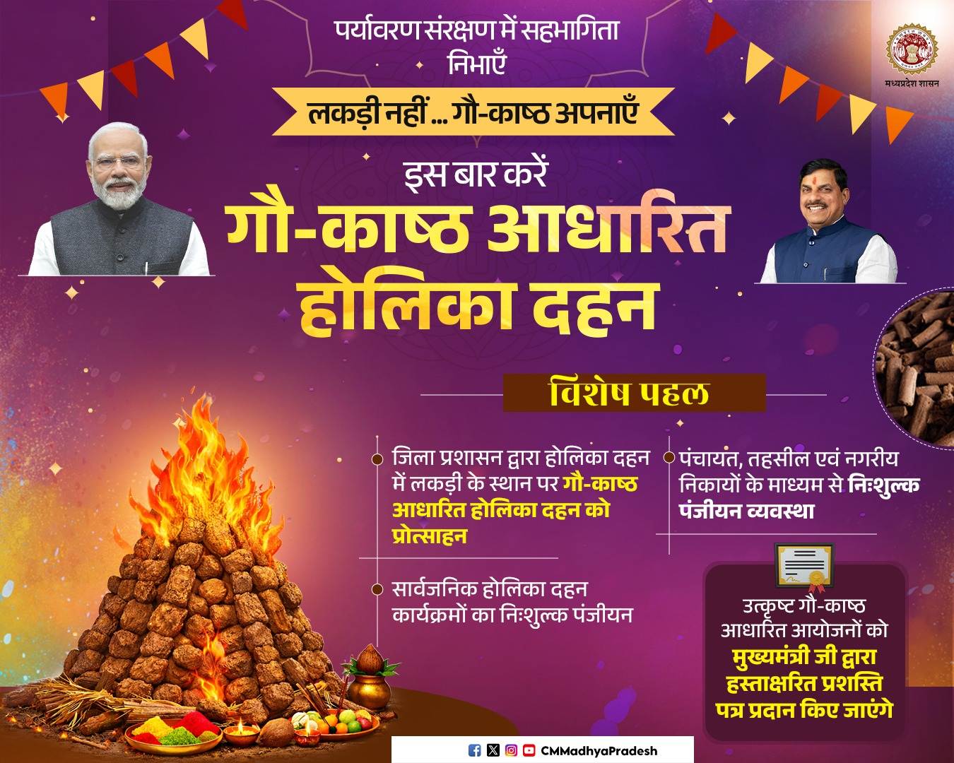 अभियान का हिस्सा है, जिसमें परंपरागत लकड़ी की जगह गौ‑काष्ठ (गोबर की बनी लकड़ी/कंडे) से होलिका दहन करने की पहल की जा रही है, ताकि वृक्ष‑कटाई कम हो और प्रदूषण घटे। गौ‑काष्ठ क्यों अपनाएंगौ‑काष्ठ गाय के गोबर और सूखे गोबर के कंडों से बनता है, जिससे पेड़ों की कटाई नहीं होती और वायु प्रदूषण भी कम होता है। इससे गौशालाओं की आय बढ़ती है, गोबर का उपयोग होता है और त्योहार को पर्यावरण‑अनुकूल बनाने में मदद मिलती है। मुख्यमंत्री द्वारा प्रशस्ति‑पत्रमुख्यमंत्री डॉ. मोहन यादव उन संस्थाओं और पदाधिकारियों को प्रशस्ति‑पत्र देकर सम्मानित करेंगे, जो पूर्ण रूप से गौ‑काष्ठ आधारित होलिका दहन करवाएंगे। ऐसी संस्थाओं को भविष्य में अन्य योजनाओं/प्रोत्साहन में प्राथमिकता भी दी जाएगी। निःशुल्क पंजीयन कैसे करेंअपने नगरीय निकाय (नगर निगम/नगर पालिका) या जनपद पंचायत के कार्यालय में संपर्क करके अपने क्षेत्र के होलिका दहन कार्यक्रम का निःशुल्फ पंजीयन कराया जा सकता है। पंजीयन के समय संस्था का नाम, पदाधिकारियों के नाम और संपर्क विवरण देने होंगे; इससे गौ‑काष्ठ आधारित होलिका की पहचान व सम्मान सुनिश्चित होगा।