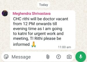 रीठी स्वास्थ्य व्यवस्था की सच्चाई कई बार किसी बड़े आंकड़े या रिपोर्ट से नहीं, बल्कि एक छोटे से संदेश से सामने आ जाती है। ऐसा ही एक संदेश हाल ही में आज सुबह 11 बजे सोशल मीडिया पर वायरल हुआ,l जहा रीठी बीएमओ ने खुद पोस्ट किया कि सीएचसी रीठी में डॉक्टर दोपहर 12 बजे से शाम तक उपलब्ध नहीं रहेंगे, क्योंकि उन्हें कटनी में जरूरी काम और मीटिंग में जाना है।”