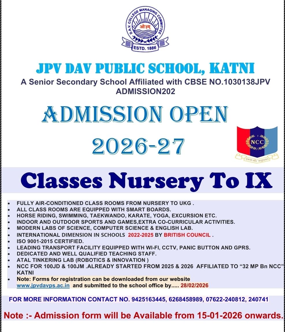 कटनी। शहर के प्रतिष्ठित शिक्षण संस्थान जेपीवी डीएवी पब्लिक स्कूल, कटनी में शैक्षणिक सत्र 2026-27 के लिए प्रवेश प्रक्रिया शुरू कर दी गई है। स्कूल प्रबंधन के अनुसार नर्सरी से कक्षा 9वीं तक के विद्यार्थियों के लिए एडमिशन ओपन हैं।